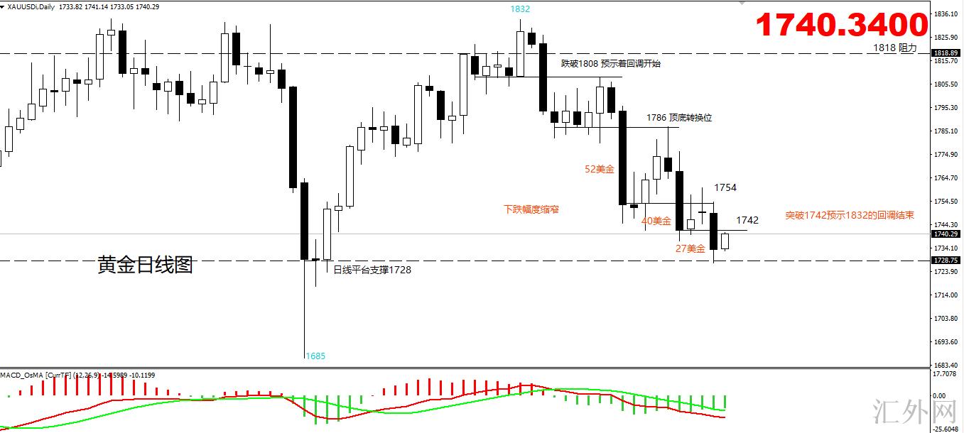 至于时间层面,发生在今明两天的几率较大,依照日K线当下的下挫节奏,这两天保持阴线的几率差不多为零,由于发生突破后,即使没到底,起码会显现两天的调动周期,而当下突破后离顶底转换位1742差异更小,基于明日pce报告的发布,以及月线收官的来临,这两天行情行情预期会扩大波幅,那么这两天往上变盘的几率还将更大。