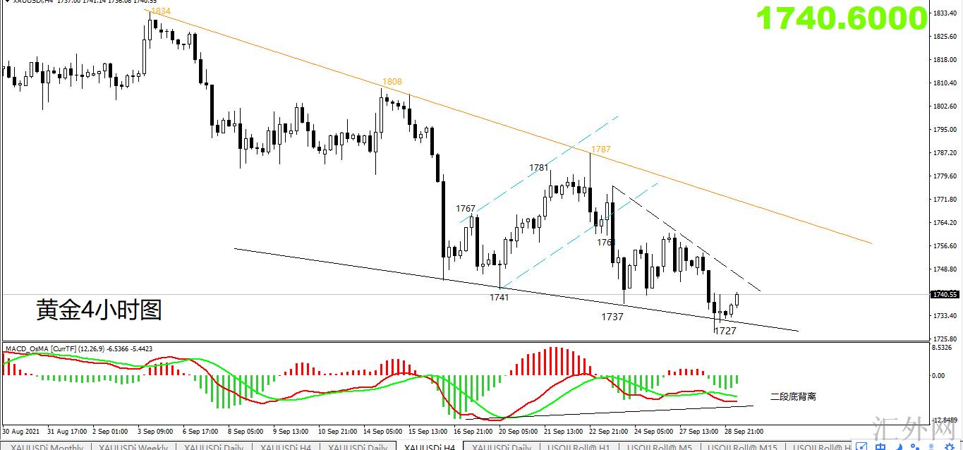 短线层面,昨天在迈出新低后面,MACD指标的二段底背离按计划形成,底部1741以来的支持线也未能朝下击穿,反而形成支撑开始回弹,日间预期将要试探昨天突破的1750平台位,极限位置预期在1760一线,日间环绕1740左右布局多单即可,4小时下滑楔形上缘压力在1770左右。短线击穿此位置会是重要的变盘信号。