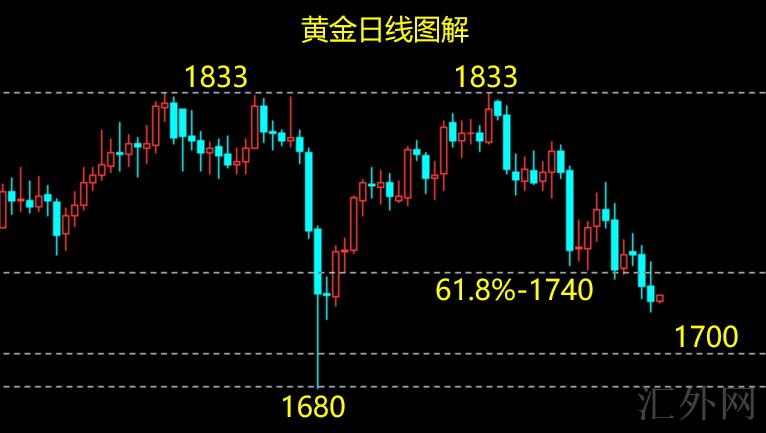 黄金,大趋势反复评述,当前价格仍处在从1833下挫的卖方周期,在1833-1680连线38.2%回撤点1776失守后我们强调后市将向61.8%回撤点1740运行;若1740失守,则会跌到1700关键点位;周内价格震荡走跌,星期三顺遂跌穿1740,日线图报得大阴后K线组合呈卖方排列,同期美指已击穿年内高点,预计黄金价格短时间内很难更改弱势局势,并会持续向1700运行;
