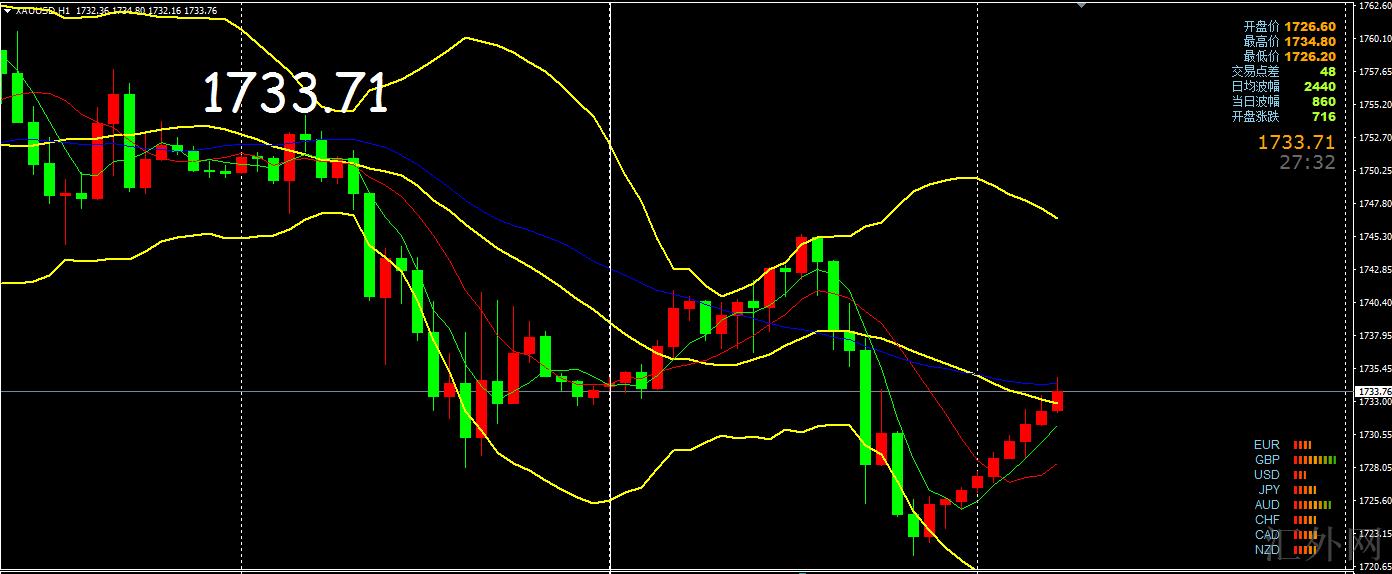 1、4小时图上,隔夜黄金的行情也是与技术行情预计高度相符的,当前行情在1720一线止跌至弹,但许多的依旧超跌后的回弹需求,暂且不具备反转条件,所以日间可期望待黄金的回弹,但空间不宜期望过大。上方着重关注短线趋势线阻力1745左右,行情遇阻至此的机会性比较大,但遇阻后很有机会演变为低点的震荡,即环绕1745—20区间执行震荡消耗,所以将来黄金即使有回涨,也需求一个震荡储蓄量能的过程。综合来说,今日操作上推荐高空低多。