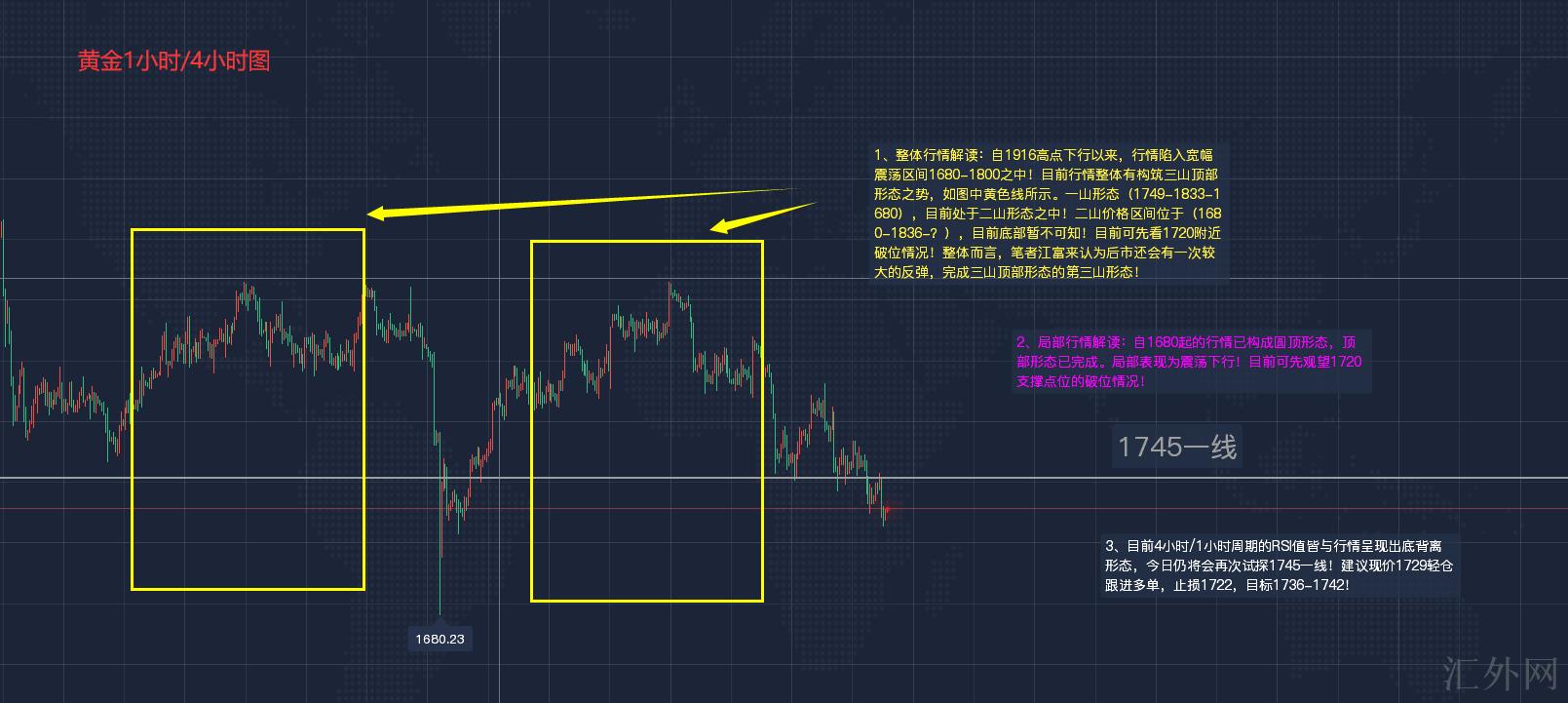 3、当前4小时/1小时周期的RSI值皆与行情呈现出底背离形态,今日继续会会又一次试探1745一线!推荐现价1728轻仓跟进多单,止损1722,计划1736-1742!