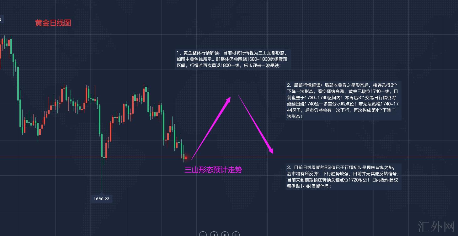 1、黄金整体行情注解:当前可将行情看为三山顶部形态,如图中黄色线所示。即整体仍会环绕1680-1830宽幅震荡区间,行情若又一次重回1800一线,后市面临一次痛跌!
