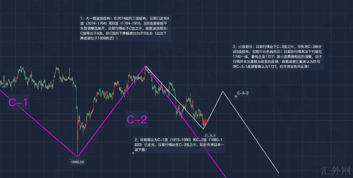 3、小浪细分:当前行情处在C-3浪当中,可先将C-3细分成5浪结构,如图中白色线所示!当前哈行情又一次下探突破1740一线,最低企及1721!故小浪需做相应的调动,受于行情仍未显现较为显著的回弹,故笔或者江富来觉得仍可将C-3-1底部暂证实为1720,后市将令有所回弹!