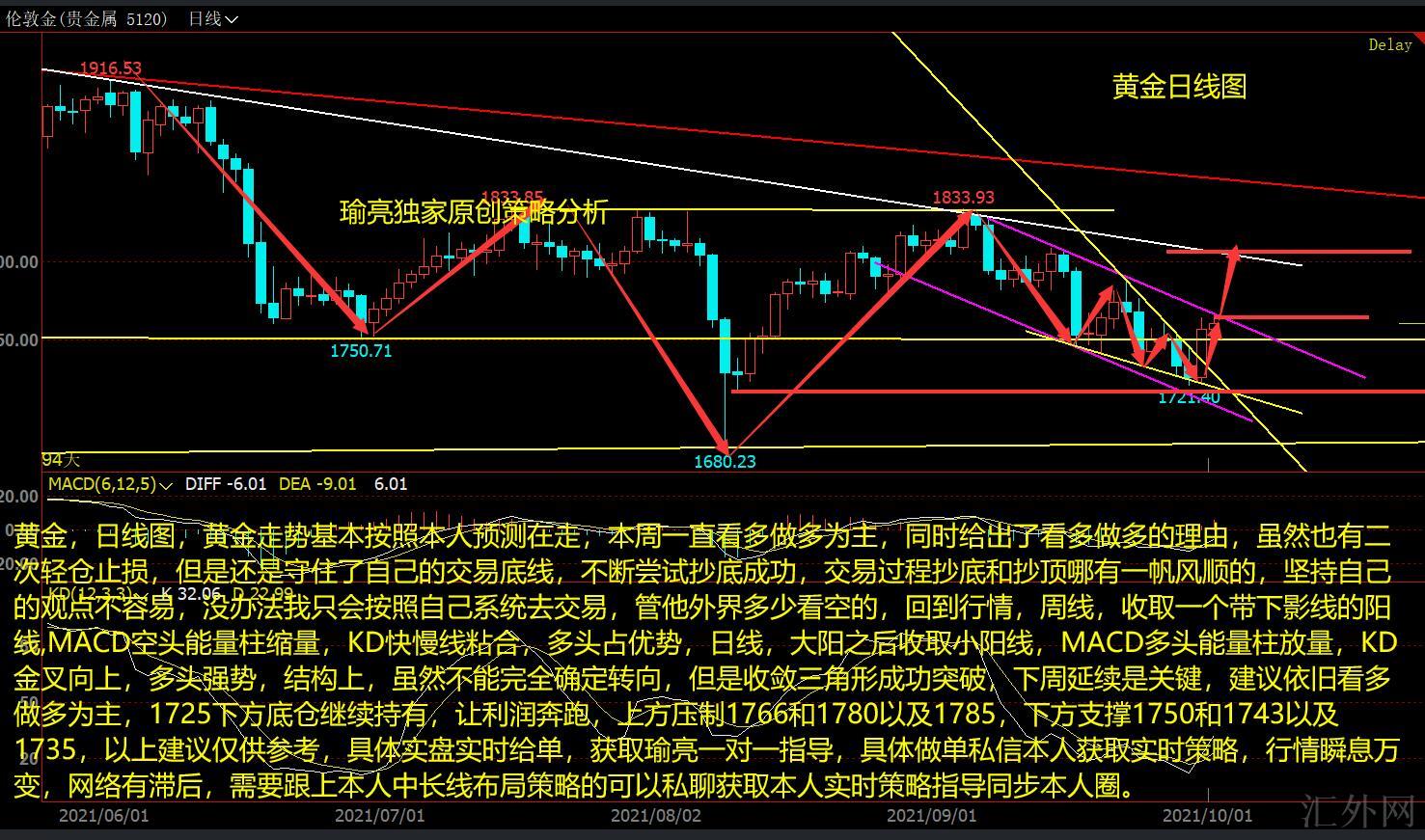 黄金,日K图,黄金行情差不多依照本人预期在走,本星期一直看涨买涨为主,同期给出了看涨买涨的理由,尽管也有二次轻仓止损,但是依旧守稳了自己的交易底线,持续试图抄底成功,交易过程抄底和抄顶哪有一帆风顺的,坚持自己的看法难以易,没办法我只会依照自己体系去交易,管他外界多少看跌的,回归行情,周线,收取一个带下影线的阳线,MACD卖方能量柱缩量,KD快慢线粘合,买方占优势,日K线,大阳后面收取小阳线,MACD买方能量柱放量,KD金叉往上,买方强劲,结构上,尽管不能完全确定倒向,但是收敛三角形成功击穿,下周保持是核心,推荐依旧看涨买涨为主,1725以下底仓持续持有,让利润奔跑,上方抑制1766和1780以及1785,以下支撑1750和1743以及1735,以上推荐仅供参考,具体实盘实时给单,获取瑜亮一对一指导,具体做单私信本人获取实时策略,行情瞬息万变,网络有落后,需求跟上本人中长线布局策略的可以私聊获取本人实时策略指导同步本人圈。
