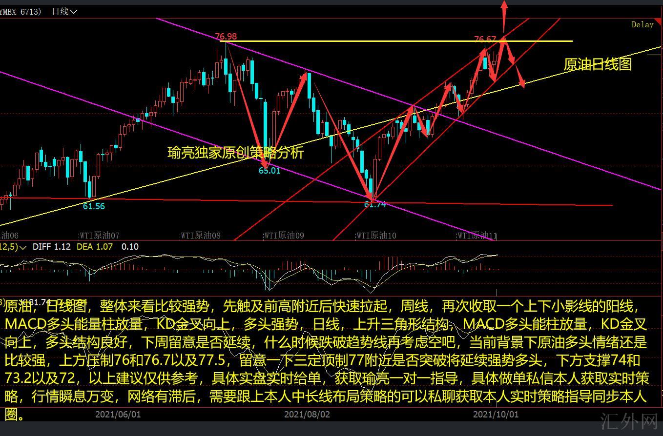 原油,周线图,整体来说比较强劲,先刷新前高左右后迅速拉起,周线,又一次收取一个上下小影线的阳线,MACD买方能量柱放量,KD金叉往上,买方强劲,日K线,上涨三角形结构,MACD买方能柱放量,KD金叉往上,买方结构不错,下周留心能否保持,何时跌穿趋势线再斟酌空吧,目前环境下原油买方情绪依旧比较强,上方抑制76和76.7以及77.5,留心一下三定顶制77左右能否击穿将保持强劲买方,以下支撑74和73.2以及72,以上推荐仅供参考,具体实盘实时给单,获取瑜亮一对一指导,具体做单私信本人获取实时策略,行情瞬息万变,网络有落后,需求跟上本人中长线布局策略的可以私聊获取本人实时策略指导同步本人圈。