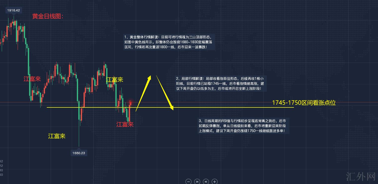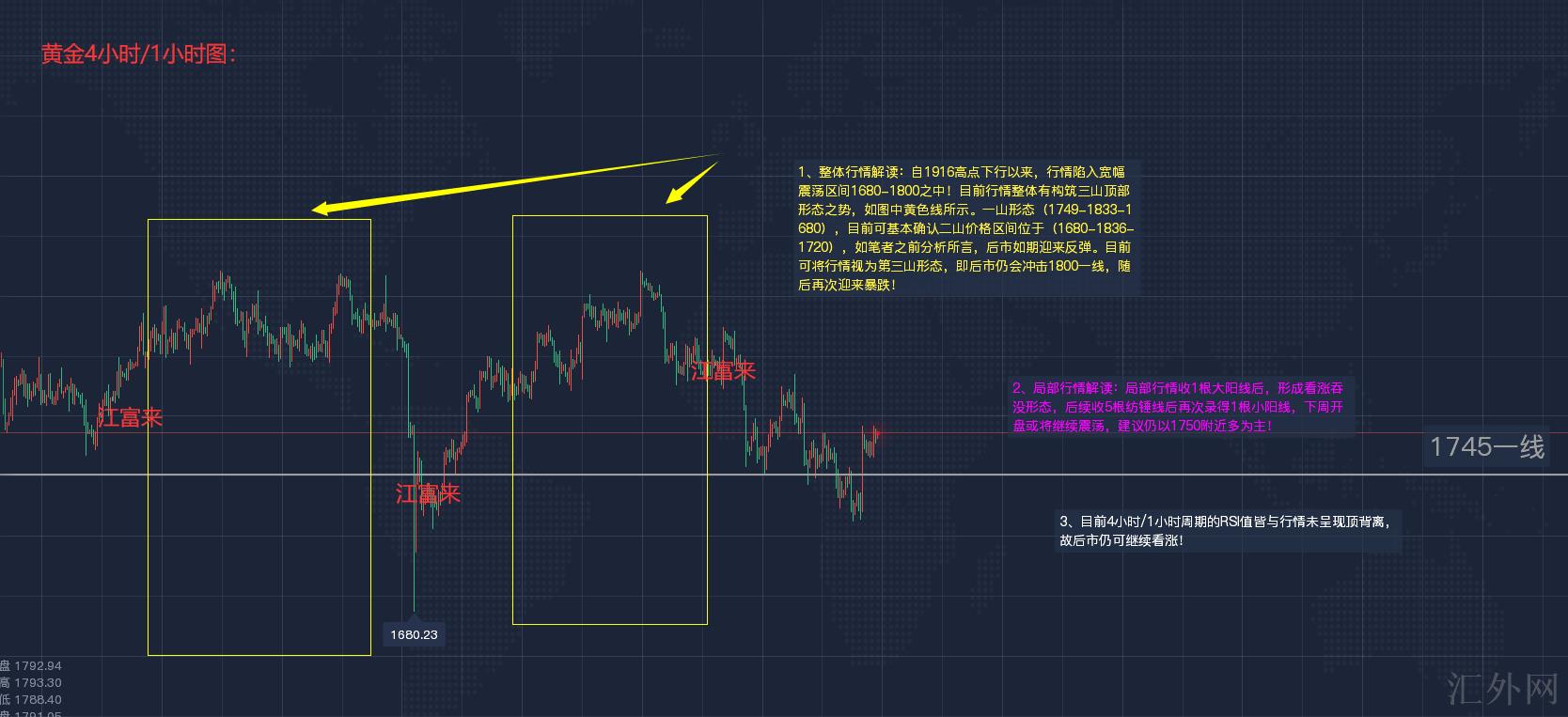 1、黄金整体行情注解:当前可将行情看为三山顶部形态,如图中黄色线所示。即整体仍会环绕1680-1830宽幅震荡区间,行情若又一次重回1800一线,后市面临一次痛跌!