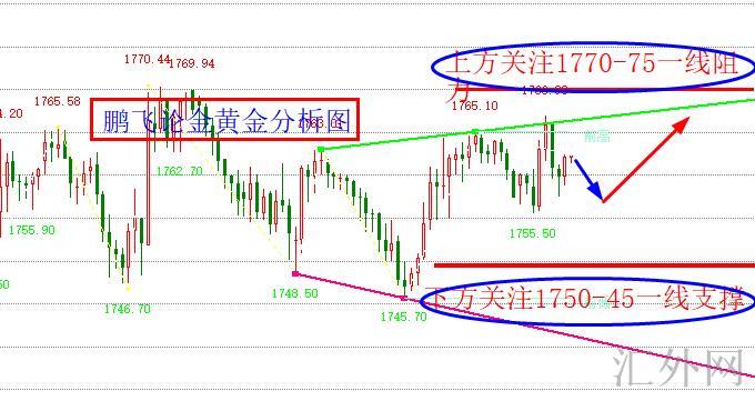 黄金日K线级别,黄金价格星期二适当下挫,日间将挑战趋势线的支持。短线行情比较震荡,操作难度较大,预期本星期五的非农数据将为黄金价格接下来的行情指示方向,此前黄金价格或许保持震荡行情。技术分析喜忧参半,一面MACD低点形成金叉,另一面黄金价格仍运行于布林带中轨以下。假使黄金价格守稳趋势线支撑,将为更深一步上升奠定基础。上方压力注意38.2%回撤位1764.27,更深一步注意50%回撤位1777.59以及61.8%回撤位1790.91。以下支撑注意23.6%回撤位1747.79,更深一步注意9月23号低点1738.12以及9月29号低点1721.76。综上所述,黄金今日交易参考上鹏飞论金推荐以回踩低多为主,回弹高空为辅,上方着重注意1770-1775一线压力,以下短时间着重注意1750-1745一线支撑。