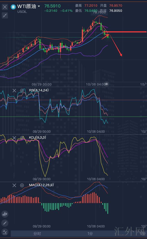 四小时来说,原油价格冲顶回调后跌穿日K线中轨,目前布林带开始缩口,MA均线死叉朝下,KDJ随机指标三线并拢朝下,MACD指标绿色量能柱开始放量,快慢线死叉朝下,短线有到顶态势,且有更深一步回调风险,上方关注中轨77.6左右压力!