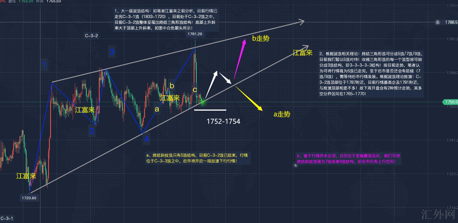 1、大一级波浪结构:如笔者江富来以前分析,当前行情已走完C-3-1浪(1833-1720),当前处在C-3-2浪当中,当前C-3-2浪整体呈现出结束三角形浪结构:底部上涨斜率大于顶部上涨斜率,如图中白色箭头所示!