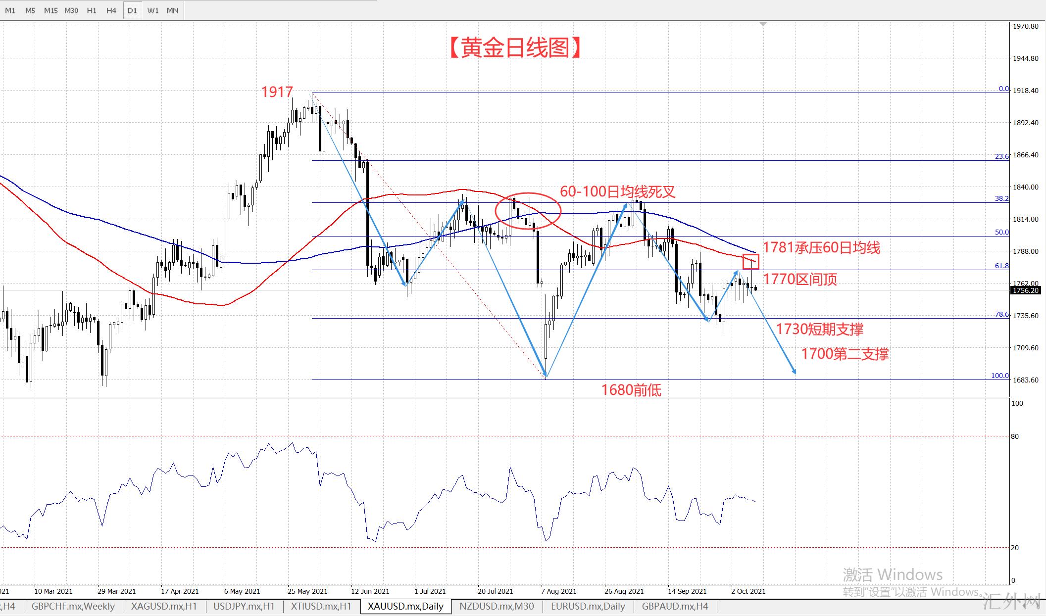 此外,日K线在上一个交易日收线又一次给出长上影,表明阻力依旧很大,再结合这60日移动均线和100日移动均线在8月份形成死叉后面,又一次的试探遇阻,足够表明黄金目前的趋势依旧处在下探当中,从1833-1680的斐波那契回撤61.8%的阻力也是迟迟不能击穿,所以依旧要看保持下挫,以下支撑注意1730和1700的两个支撑。