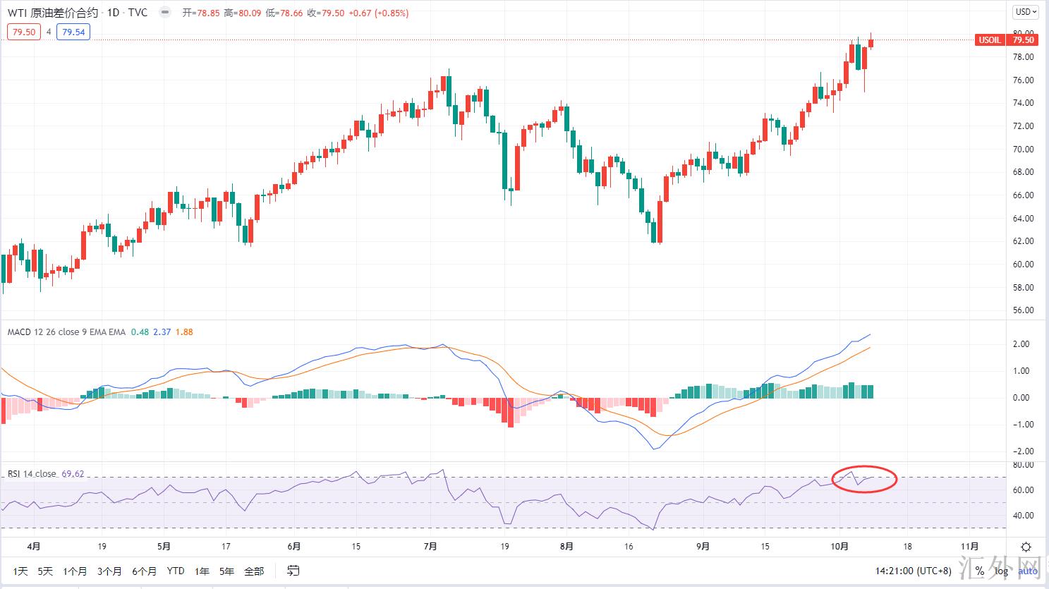 来说原油,原油从去年到底后面的上涨可以说是月线级别的上涨,也可以说是周线级别的上涨,而且从周线和月线来说,还远没有到顶,从当前的日K线来说,原油在涨破了前期高位76.8后面隔夜最高已经涨到80.1一线,到了Goldman Sachs的计划点,Goldman Sachs终于靠谱一回,但是这还不是着重。