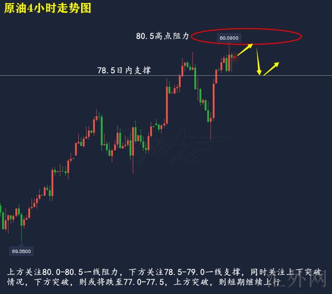 原油技术分析来分析,日K线上,星期五原油开盘下挫至MA5日移动均线后展开上涨,盘中刺破80.0关键点位位置后回调,报得带上影线的中阳,日K线上,原油在经历星期三星期四的回踩后重返买方,上涨通道维持不错,但也要审慎又一次到顶回调;4小时上,星期五原油依托MA10日移动均线上涨,盘中刷新上缘位置后适当回调,目前布林带处在开口期,MA均线迈出双金叉,KDJ随机指标三线朝下,到达超买,MACD指标红色量能柱连续放量,快慢线金叉往上,综合来说,原油当前短时间恐会下探至支撑上升,下星期一交易参考回撤买涨为主,回弹买跌为辅,以下注意78.5-79.0一线支撑,上方注意80.0-80.5一线压力,同期关注上下击穿,上方击穿则持续上涨,以下击穿,则短时间到顶恐会跌向77.0-77.5一线左右。