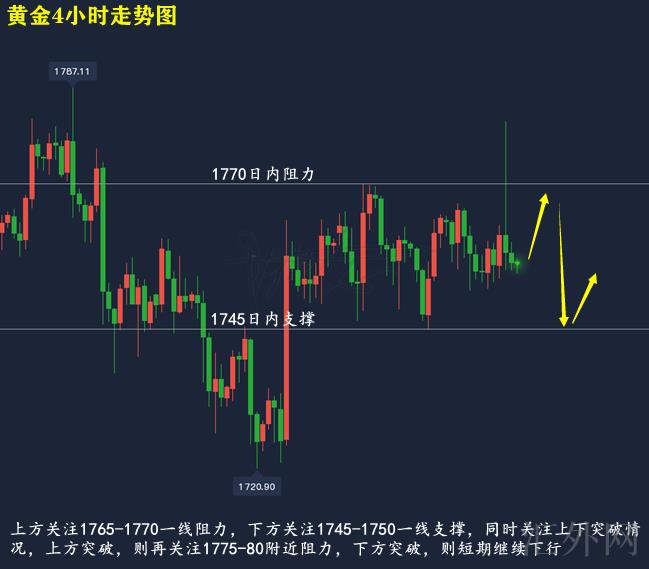 黄金技术分析来分析,日K线上,星期五黄金受报告提升,刺破中轨MA20日移动均线后回调,报得带上影线的小阳,日K线上,受于行情仍未有效击穿上方压力,即使适当收阳,但仍遇阻,仍有下探的机会性;4小时上,星期五黄金适当持于盘整后冲顶回调,盘中刺破上缘后回调仍遇阻于中轨以下,目前布林带处在平口期,MA均线三线朝下,KDJ随机指标三线朝下,到达超卖,MACD指标绿色量能柱连续放量,快慢线死叉朝下,综合来说,黄金当前上方均线仍维持抑制,仍有下探,但目前技术分析面对超卖,下星期一推荐高空低多执行操作,上方注意1765-1770一线压力,以下注意1745-1750一线支撑,同期日间关注上下击穿情形,以下击穿则持续下探,上方击穿,则持续注意1775-80左右压力。