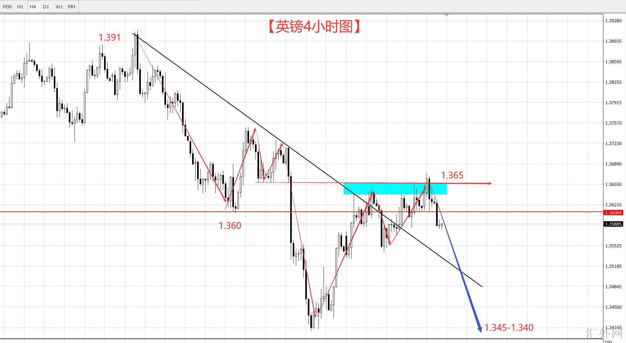 技术分析的状况也比较显著,4小时结构在历经了又一次冲顶试探后面,并没有什么结果,又一次回归了1.360的以下,足够表明了英镑最近并没有具备强劲击穿的条件,此外,英镑最近的行情差不多均为一波修整伴随一波增速下探,尽管击穿了来从1.391的下探趋势阻力,但也不足够更改英镑的卖方趋势,而这段1.365-1.358的震荡,上涨显著是无望,所以依旧要看一波朝下击穿1.358后面增速下探。