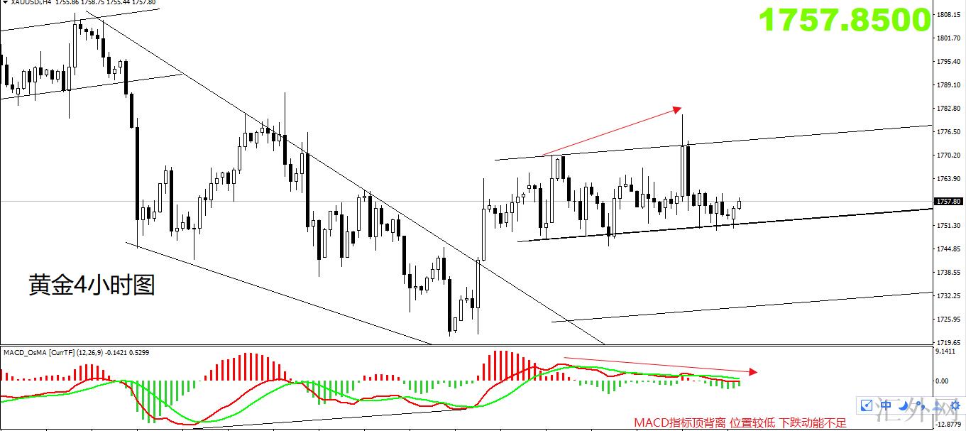 需求注意的是,在上星期五非农就业报告发布后面,黄金价格迈出高峰1782,形成了k线的高位抬高,MACD指标快慢线朝下运行的顶背离看空状态,但是因为于快慢线的位置较底,与零轴较近,并没有形成太强的卖方量能,黄金价格近期的下挫也略显犹豫,下跌趋势较缓,小时线均为以小阴线收录,而回弹却均为大阳推涨,该种情形大家便需求谨防行情迈出高峰,形成二段的顶背离后再下挫,这也是前面给大家讲过的突破后高峰不追多的部分原因,高峰位置可以关注初始压力1787.此位置是以前利率会议冲顶回调的高位,更深一步压力注意1794,此位置是一个核心的临界点,行情多次在这个位置受支撑或者回弹,最近刷新此位置都可以斟酌空单的操作。