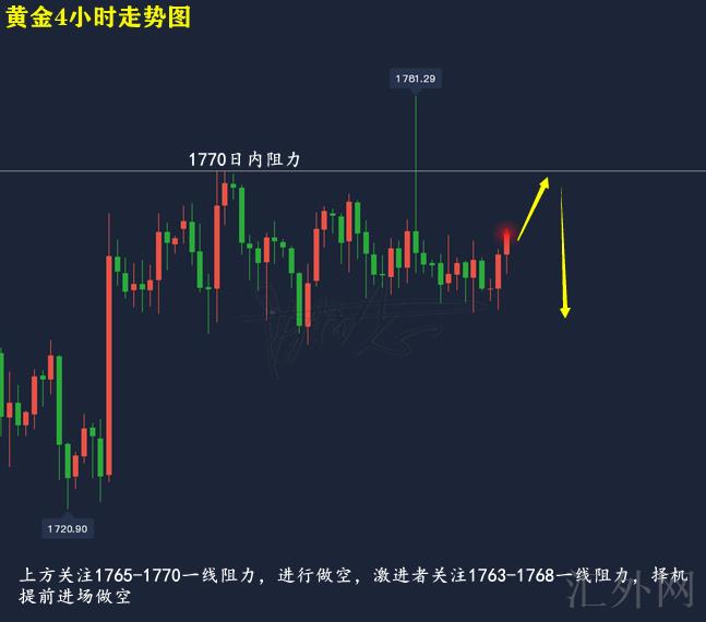 黄金技术分析来分析,日K线上,隔日黄金开盘适当上升后遇阻于中轨位置展开下探,盘中跌穿MA10日移动均线后适当回涨,报得带上下影线的中阴,日K线上,今日行情开盘上升,但前期高位抑制依旧存在,日间仍有下探机会,或持于中轨左右盘整;4小时上,隔日行情多次刺破中轨位置没有成功后又一次下探,目前布林带马上开口,MA均线马上迈出双金叉,KDJ随机指标三线往上,到达超买,MACD指标红色量能柱开始显现,快慢线金叉往上,综合来说,黄金早间上升,但目前技术分析面对超买,日间仍有下探机会,日间推荐持续维持买跌,上方注意1765-1770一线压力,激进派可注意1763-1768一线压力,择机提早买跌,若上方显现击穿,则注意1775-1780一线压力,周线抑制持续买跌。