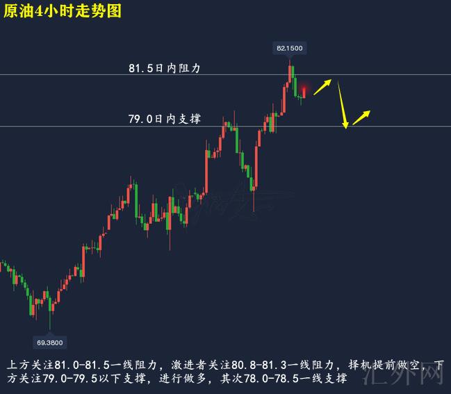 原油技术分析来分析,日K线上,隔日行情开盘上升,并在创下高后刺破上缘后回调,报得带上影线的中阳,日K线上,今日行情持于昨日收盘位置运行,预期仍有下探机会,恐会依托MA5-10日移动均线又一次上涨;4小时上,隔日原油呈震荡上涨行情,持续上涨,并在刺破上缘后回调,目前布林带处在开口期,MA均线马上迈出死叉,KDJ随机指标三线朝下,MACD指标绿色量能柱开始显现,快慢线死叉朝下,综合来说,原油当前仍有下探,日间交易参考先空后多,上方注意81.0-81.5一线压力,激进派注意80.8-81.3一线压力择机提早买跌,以下注意79.0-79.5一线支撑,其次78.0-78.5一线支撑,执行买涨。