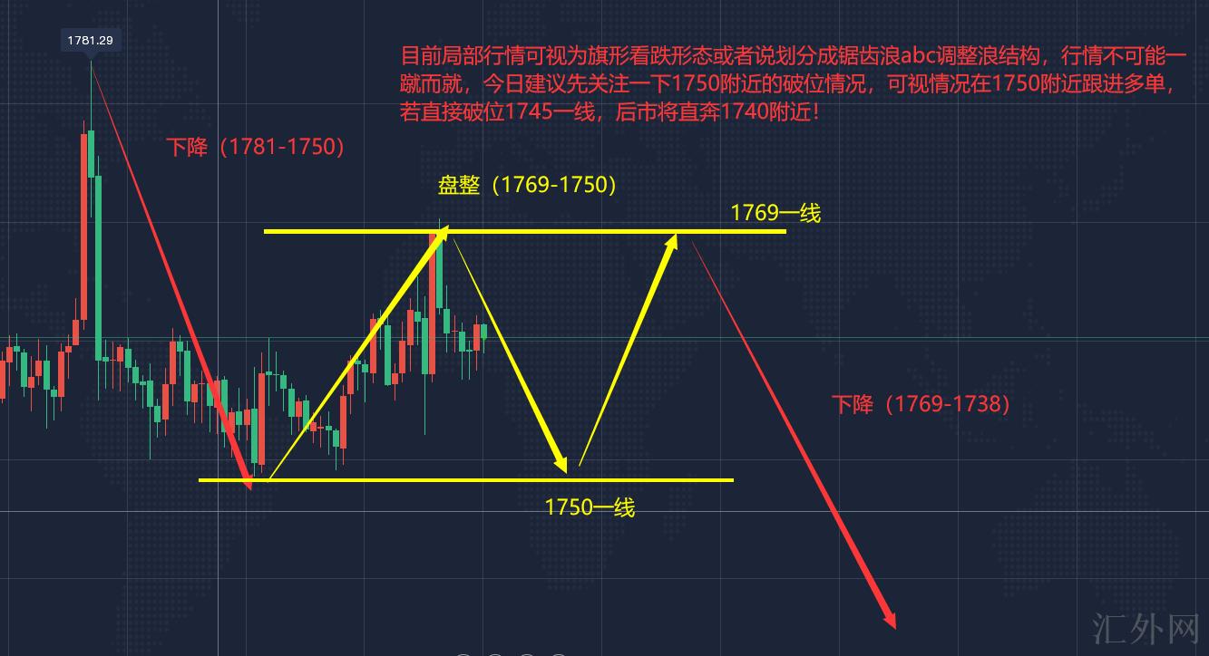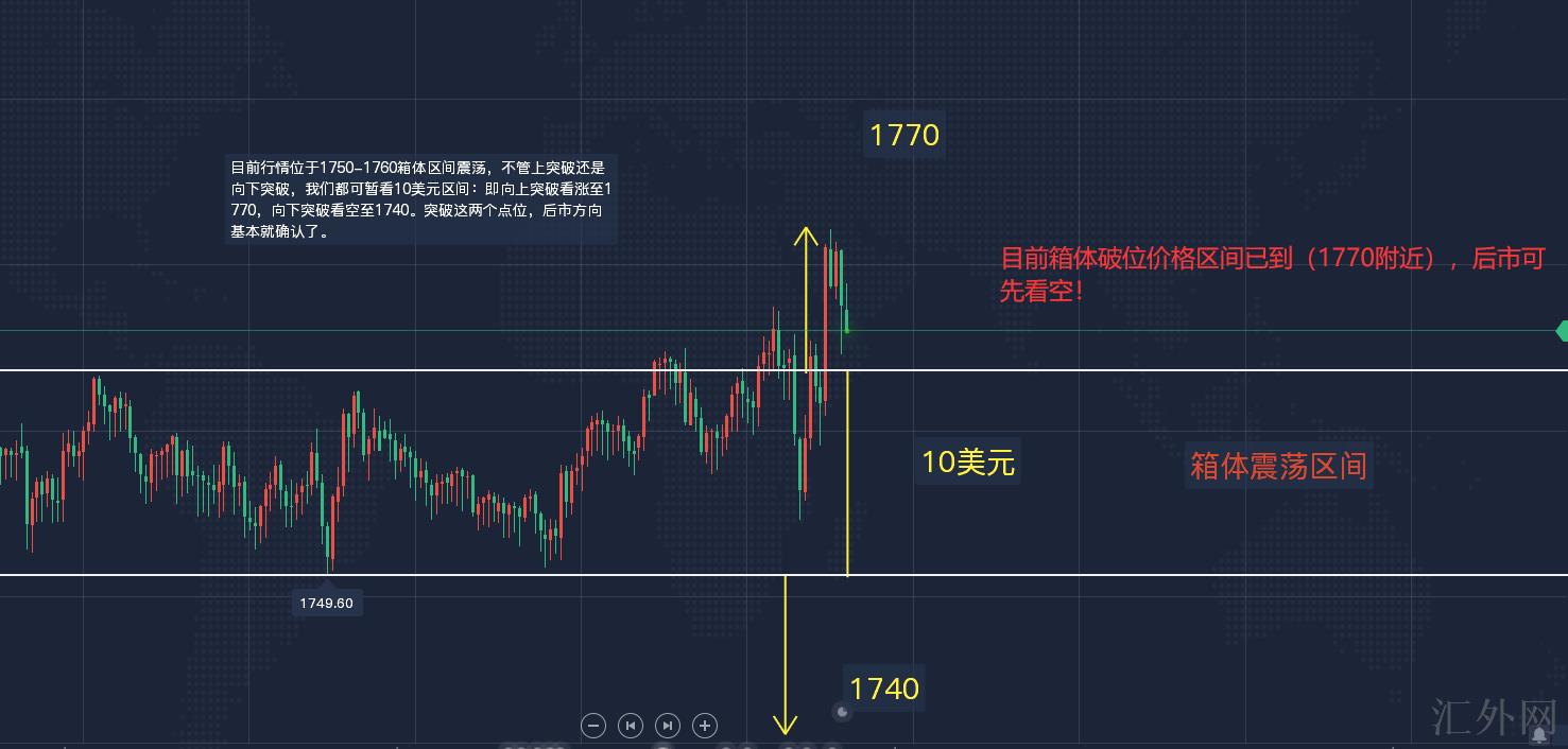 当前行情位于1750-1760箱体区间震荡,不管上击穿依旧下破,我们都可暂看10美元区间:即上破看多到1770,下破看跌到1740。击穿这两个点位,后市方向差不多就证实了。当前行情向往上击穿位1760一线,最高企及1769,仍未击穿1770一线,上升价格区间已到.今日恐会持续试探1740箱体下轨击穿极限!