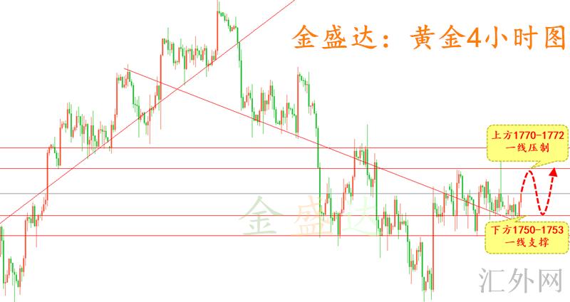 上面分析图是当前的思路。我们依旧依托1750支撑布局多单,昨天行情和今天行情差不多,昨天我们也是在1752两次布局多,从形态向上瞧1745不跌穿就会又一次试探1770,靠差不多1770可以反手买跌,这个位置是卖方活动的区域,先看20个点的区域震荡,金盛达预期今天的行情会保持震荡。