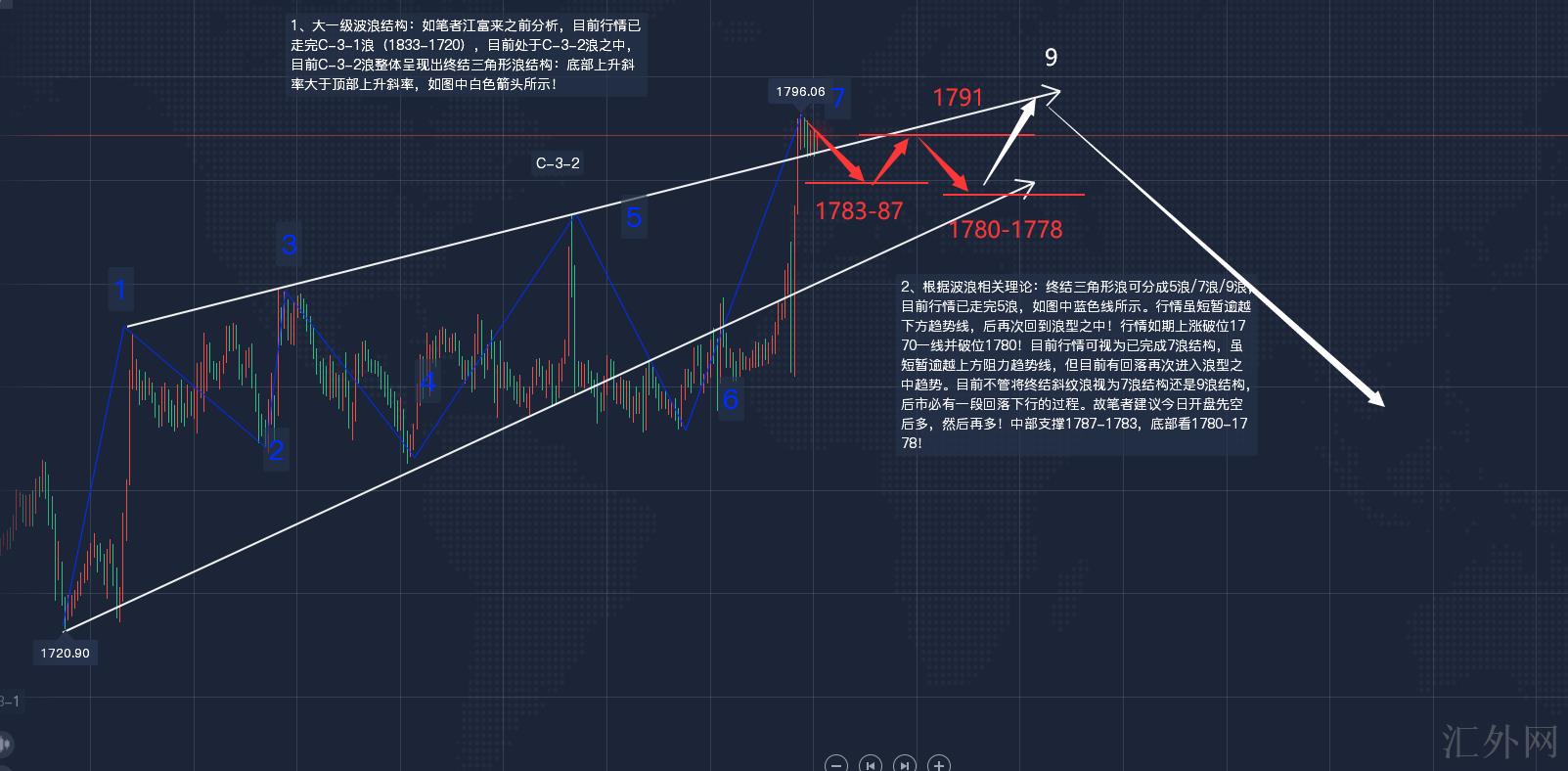 2、依据波浪有关理论:结束三角形浪可分成5浪/7浪/9浪,当前行情已走完5浪,如图中蓝色线所示。行情虽短暂跨越以下趋势线,后又一次回归浪型当中!行情按计划上升突破1770一线并突破1780!当前行情可看为已完成7浪结构,虽短暂跨越上方压力趋势线,但当前有回调又一次进入浪型当中趋势。当前不管将结束斜纹浪看为7浪结构依旧9浪结构,后市必有一波回调下探的过程。故笔者推荐今日开盘先空后多,随后再多!中部支撑1787-1783,底部看1780-1778!