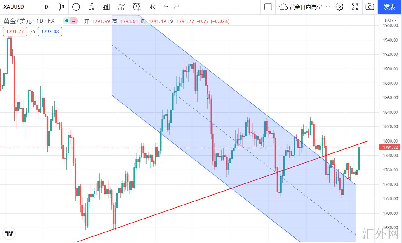 黄金昨天暴涨,日K线收大阳,最高刷新1796一线,恰好是受趋势线抑制。