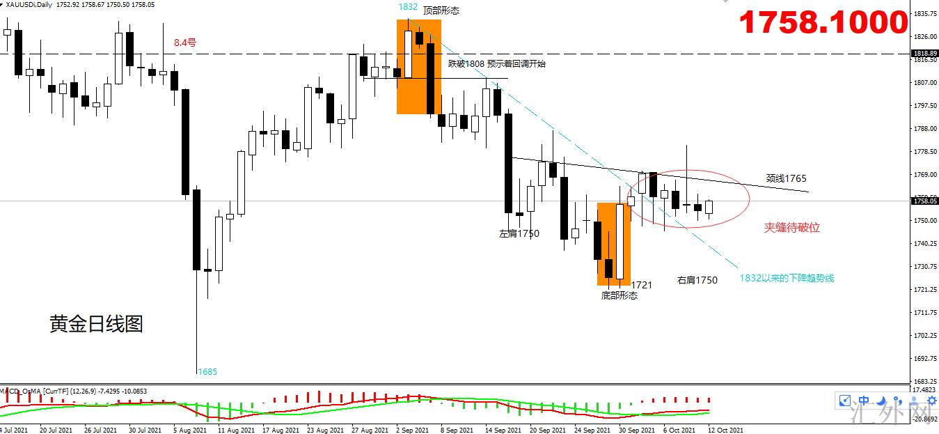 又一次入场多单的位置可以关注头肩底颈线1765,此位置突破后,假使进入调动期,回踩此位置左右的几率较大,到时斟酌多单入场,若日K线再无意中跌至此位置以下,则此段1721以来的上涨终结。