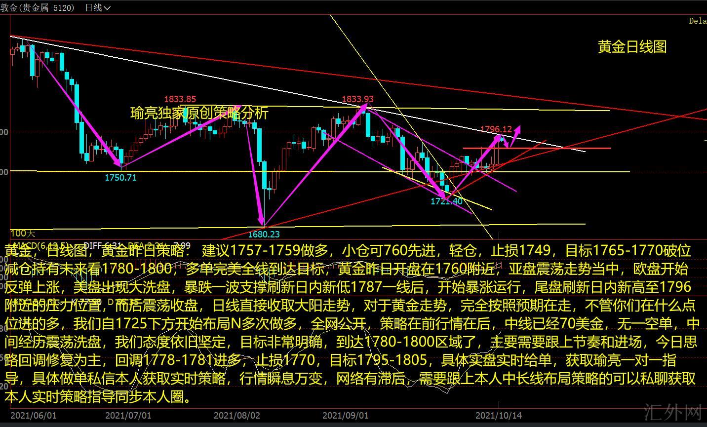 黄金,日K图,黄金昨日策略: 推荐1757-1759买涨,小仓可760先进,轻仓,止损1749,计划1765-1770突破减仓持有将来看1780-1800,多单完美全线到达计划,黄金昨日开盘在1760左右,早盘震荡行情当中,欧盘开始回弹上升,美盘显现大洗盘,痛跌一次支撑创下日间新低1787一线后,开始大涨运行,收盘创下日间高峰到1796左右的阻力位置,而后震荡收盘,日K线直接收取大阳行情,对于黄金行情,完全依照预计在走,不管你们在什么点位进的多,我们从1725以下开始布局N多次买涨,全网公开,策略在前行情在后,中线已经70美金,无一空单,中间历经震荡洗盘,我们立场依旧坚定,计划异常清晰,到达1780-1800区域了,首要需求跟上节奏和进场,今日思路回踩修复为主,回踩1778-1781进多,止损1770,计划1795-1805,具体实盘实时给单,获取瑜亮一对一指导,具体做单私信本人获取实时策略,行情瞬息万变,网络有落后,需求跟上本人中长线布局策略的可以私聊获取本人实时策略指导同步本人圈。