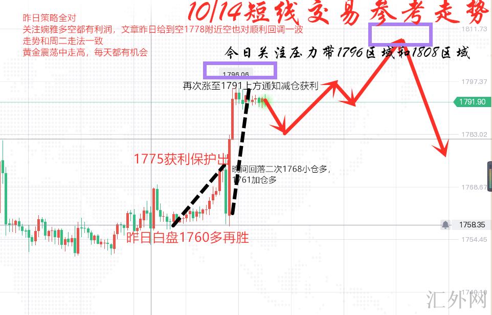 今日黄金亚盘先看个小调动,昨日黄金夜里大阳拉直接到达1796阻力带左右,今日交易上我们以稳为主。亚盘强弱分水在1791,黄金强劲上升应当会直接在1788-91上推涨出高去试探上方1808一带的压力,