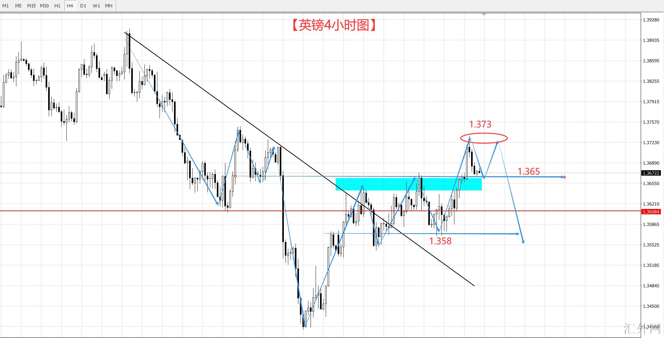 交易层面,早前1.357-1.362的空,昨天1.373止损出局,今天持续在1.373-1.371入场空,防守1.379,计划持续看前低1.340-1.345。