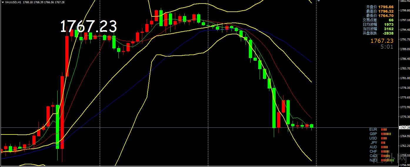 星期五美市收盘,黄金现货收报得1767.23美元每盎司,大幅下挫28.21美元或1.57%,盘中最低刷新1764.69美元,最高刷新1796.37美元。这周,黄金现货上升10.38美元或0.59%。
