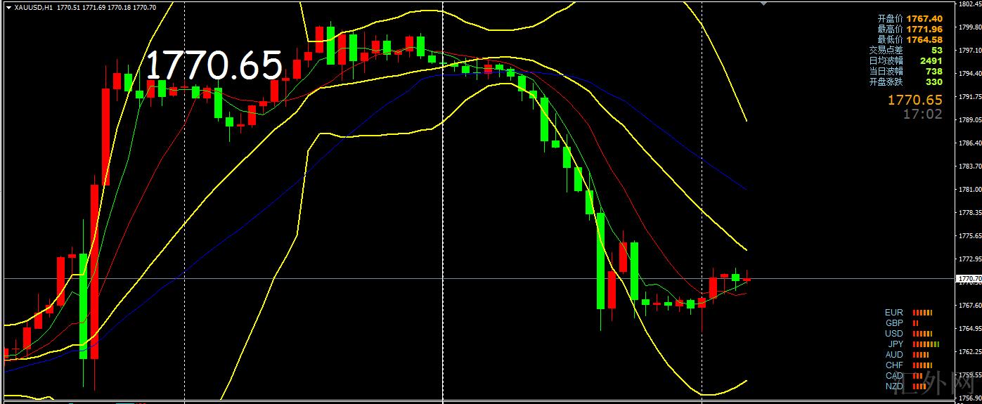 日K线来说,黄金上星期三大幅推涨差不多40美金到1790上方,星期四再次适当推涨到1800关键点位,随后开始走软,星期五开盘就一直连续走跌,美盘增速下跌最低到1764一线,较日间高位下挫30美金;黄金此番一涨一跌也没有清晰给出方向。
