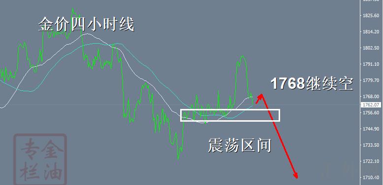 亚盘黄金回弹强度有限,直接在1770一线现价空进场(可寻到笔者确认),大阴线持续摸底,到达1762一线,空单达到开门红了,持续看支撑点1755一线,做好准备