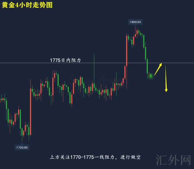 黄金技术分析来分析,日K线上,上星期五黄金开盘短暂持于盘整后展开下探,并报得实体大阴,并失守MA10日移动均线位置,日K线上,受于黄金仍未打破千八关键点位抑制,同期失守支撑点置,短时间恐会持续下探;4小时上,上星期五黄金呈震荡下探行情,持续下探,目前布林带处在开口期,MA均线马上迈出双死叉,KDJ随机指标三线朝下,到达超买,MACD指标绿色量能柱连续放量,快慢线死叉朝下,综合来说,黄金当前失守中轨位置,均线形成抑制,恐会持续下探,下星期一推荐回弹买跌为主,上方注意1770-1775一线压力。