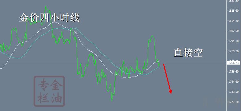黄金价格四小时k线持续处在下跌趋势中,大阴线直接突破80均线了,均线持续呈现朝下掉头了,回弹就是空的可能,1775以下任何点位均为空,看跌已空了