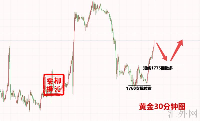 黄金价格四小时线k线,50均线以及80均线显现显著的往上倾斜,朝下运行直接被摁下暂停键,这是买方的信号,同期大阳线差不多没有回调的余地,一路干到北的节奏,当前k线方向标已变,回调1775直接反手多