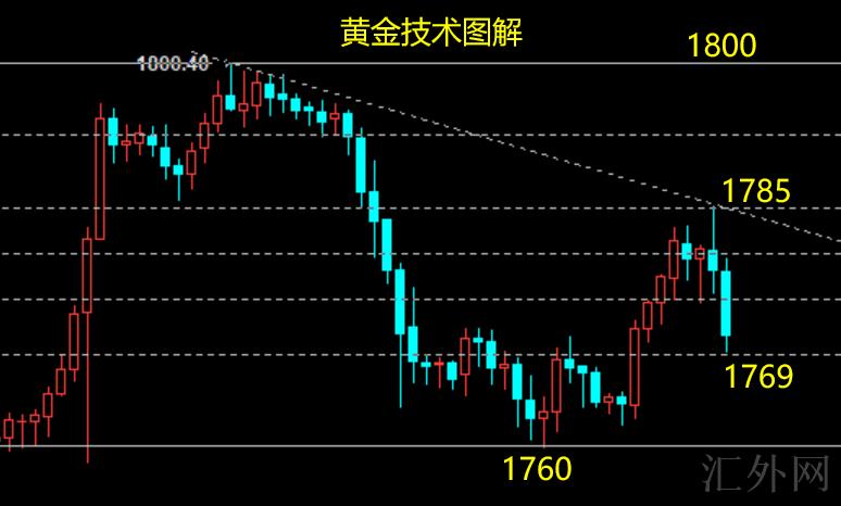 星期一价格下探1760后日间没有保持,回弹拉高到1760-1800连线61.8%节点1785遇阻,22点收线后4H图报得长上影大阴,回到卖方,周尾仍可回看1750;晚盘时段短线压力1774,强阻1776-1778;短线支撑1769,突破则回看1760;