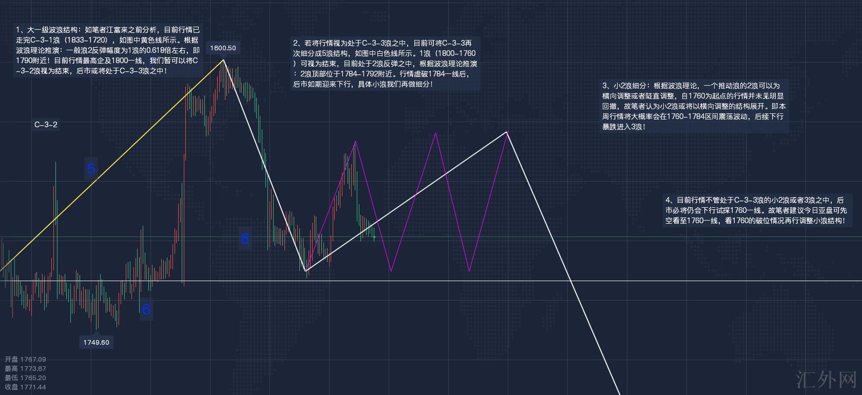 3、小2浪细分:依据波浪理论,一个助推浪的2浪可以为横向调动或者陡直调动,从1760为起点的行情仍未见显著回撤,故笔者觉得小2浪恐会以横向调动的结构展开。即这周行情将大约率会在1760-1784区间震荡震荡,后续下探痛跌进入3浪!