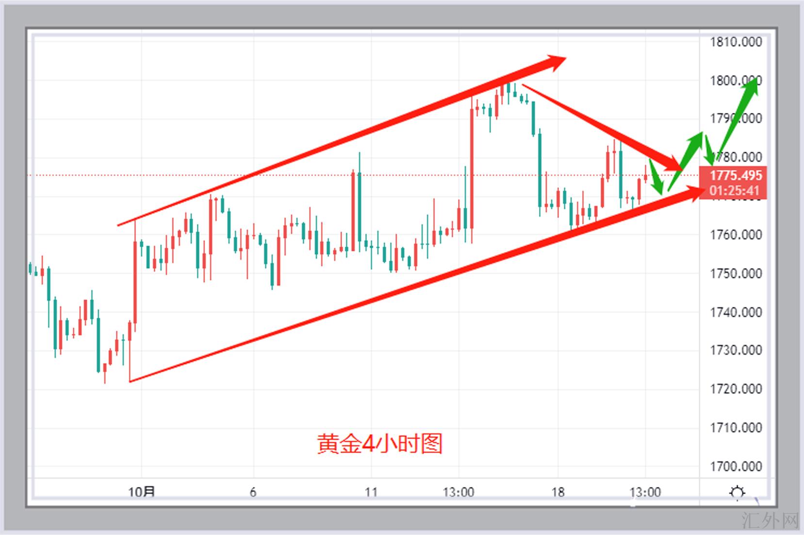 受于黄金这几天的调动一直是在10月13号上升阳烛规模区间执行,而且,黄金以下的有效支撑点亦在持续抬升,所以,我今天愈加倾向黄金会往上执行击穿,持续去试探前高的压力位置。诚然了,黄金在去试探前高1800左右的压力以前,依旧会有不少行情上的改变。