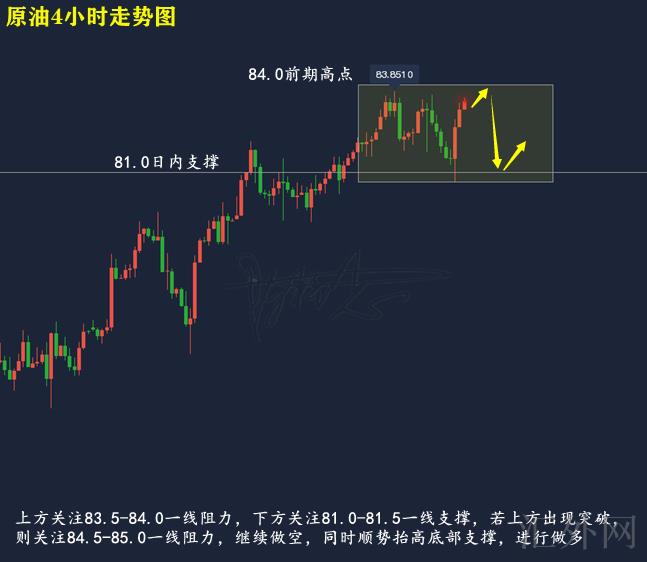 原油技术分析来分析,日K线上,隔日原油开盘展开下挫,并短暂失守MA10日移动均线后回涨,并收回所有下跌趋势展开上升,报得带长下影线的中阳,日K线上,即使原油收回所有下跌趋势报得阳线,但并为打破84.0关键点位,需更深一步上升,需求打破前高84.0-85.0名置,同期技术分析连续呈现超买现象,所以仍有高点盘整的机会性;4小时上,隔日原油开盘呈震荡下探行情,持续下探,并在刺破下缘后回涨转涨,呈震荡上涨创下高,目前布林带处在开口期,MA均线将迈出金叉,KDJ随机指标三线往上,到达超买,MACD指标底背离,快慢线有金叉往上趋势,综合来说,日间原油在没有击穿84.0关键点位位置后仍有下探机会,日间推荐高空低多执行操作,上方注意83.5-84.0一线压力,以下注意81.0-81.5一线支撑,若行情显现上方击穿,则再依托84.5-85.0一线压力买跌,同期顺势抬高以下支撑执行买涨。