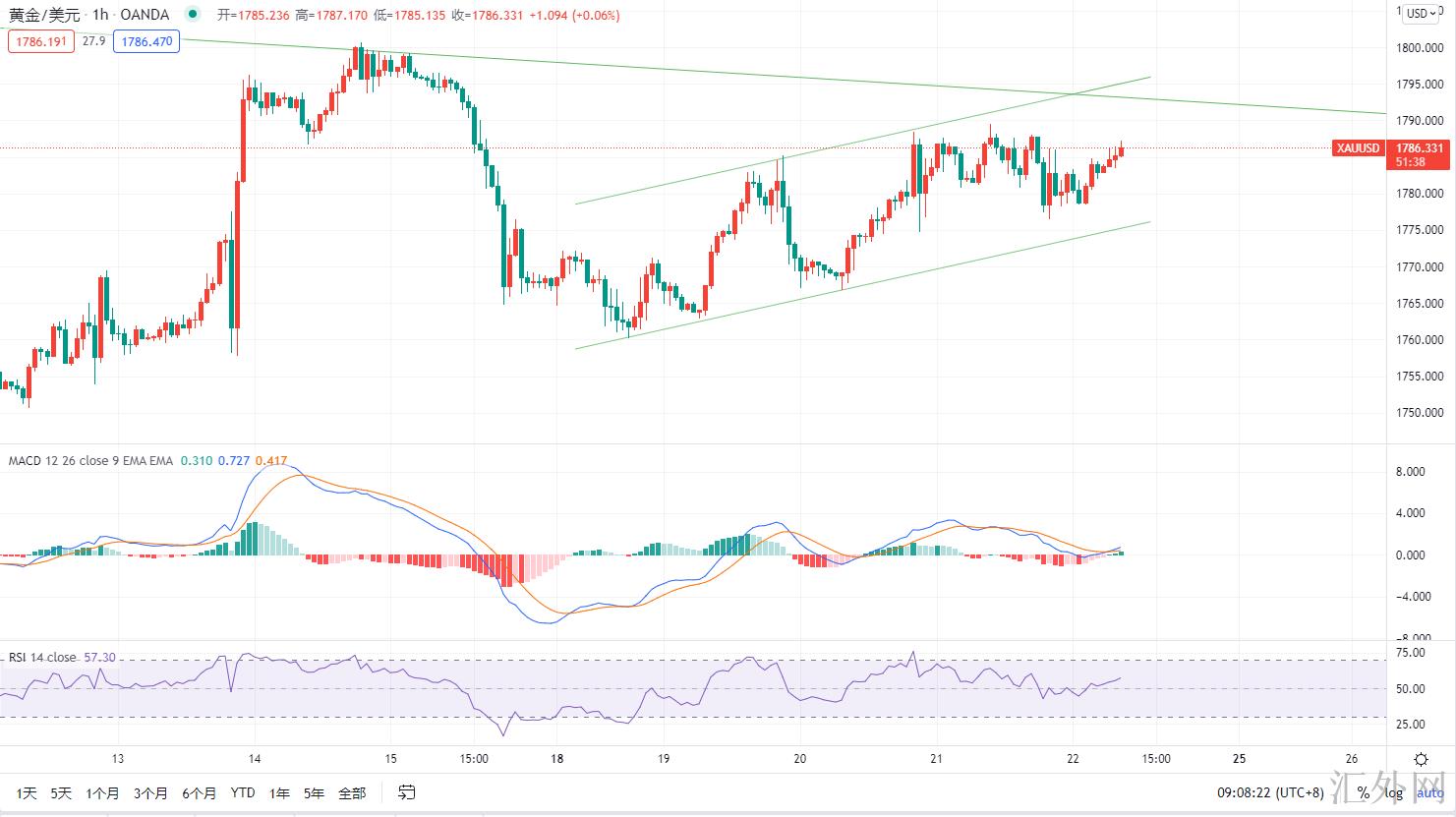 星期一,在黄金迈出了1760的低位后面,配合上星期五的低位1765,黄金在小时级别迈出了一个短时间底部,而后动员迈出了这段震荡上涨,不管是震荡修正依旧回弹修正,黄金均已满足了需求,应当要开放回调,但是黄金迟迟不跌,表明黄金的这段震荡上涨并没有是一个简单的下挫后面的修正,更符合看空旗型的需求。由于一般的修正一般历时不会这么久,特别是黄金当前导致一个小时级别的行情。