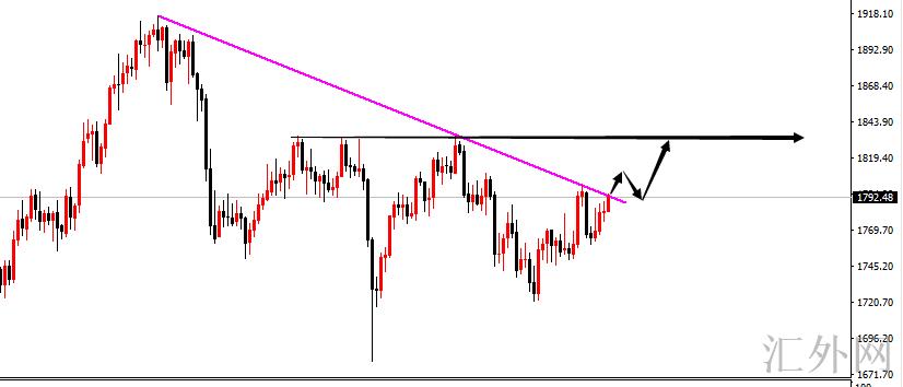 昨日我们提及了上方阻力在1792一线,这里是日线图下滑趋势线的延长位,也是前一次下挫的增速点,然而很显著主力资金也认识到了这一点,没有选择在昨天进攻,而是先做了休整。伴随时间的推动今天阻力位已经有所下探,而黄金在欧盘直接冲顶涨破了压力,这其实动机就很显著了,买方的计划远不止于此,甚至不导致1800,我觉得更有机会要去到1835的前期平台顶部。这一带才是市场着重博弈的分界线。