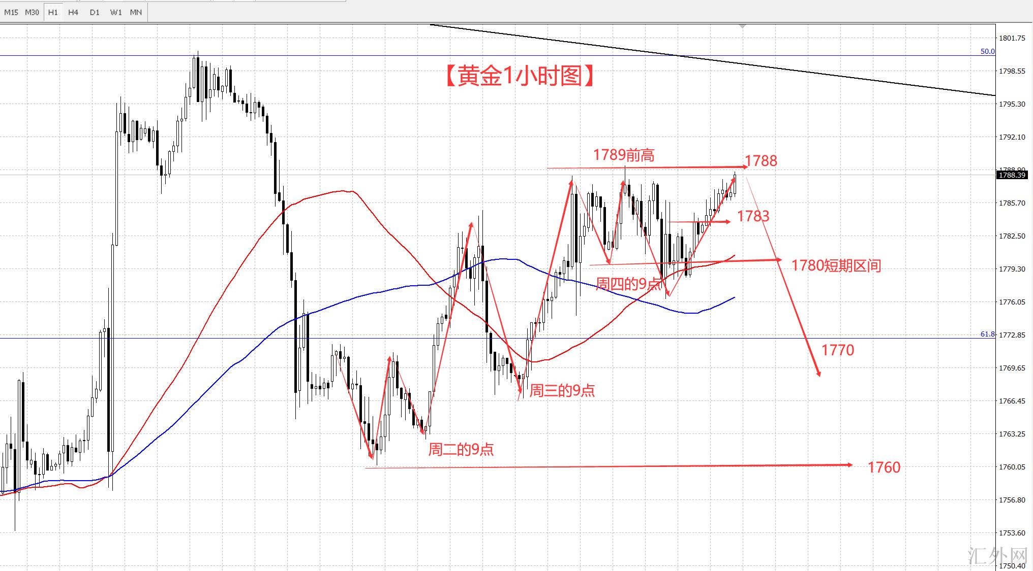 先不斟酌趋势的困难,就拿1小时的这几天的行情中来说,星期二至星期三的亚盘差不多均为单边推涨到欧盘终结,今天也不例外,也是亚盘单边上升,然而从昨天到今天的时间,上方试探1788后面,都丧失了上升的量能,当前黄金价格再一次给到了1788-1785开始受压,假使依旧做不足击穿,那么今天欧元兑美元盘的时间黄金依旧得朝下执行试探1780和1770。