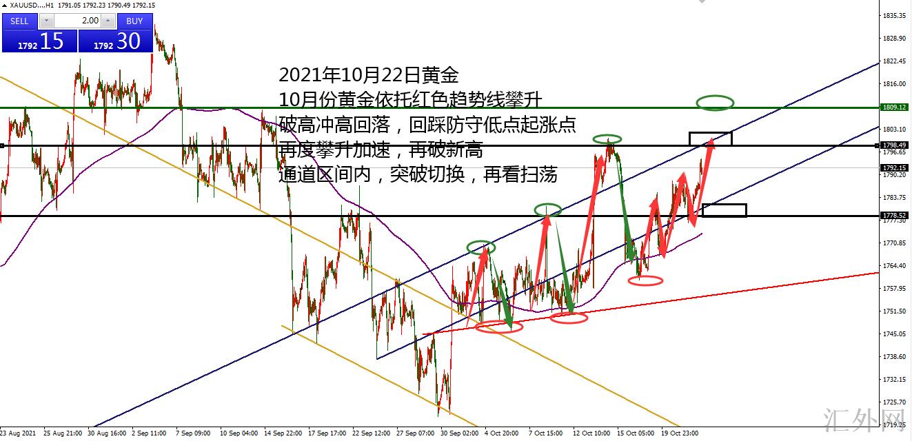 从这周星期二开始,给出的思路便是,看价格依托1760往上升高,以守稳起涨点和低位作为依托,往上升高冲刺,第一步回归通道线内,这是星期三已经达到了,接连两条均为回踩通道线随后往上升高,高位逐次攀升,也快到通道上缘,第二步便是击穿通道上缘和第三步击穿高峰,伴随时间的推动,通道上缘位置攀升到1798-1800区域,刚好第二步和第三步的位置是重合的,参考这个思路,也就是在价格击穿后面,有希望形成新的高位,再向上的阻力便是1810区域了。