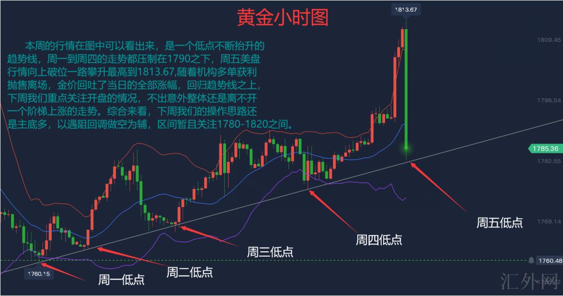 星期五行情完美符合我们的预期,尽管上升突破1800的压力位,但是在凌晨机构介入使黄金价格吐回全部升幅,下探最低高达1780左右。冲顶回调,下周黄金开盘有希望又一次续涨。这周的行情在图中可以看出来,是一个低位持续抬升的趋势线,星期一到星期四的行情都抑制在1790之下,星期五美盘行情向_往上击穿位一路升高最高1813.67伴随机构多单获利抛压退场,黄金价格吐回了当日的全部升幅,回到趋势线之上,下周我们着重关注开盘的情形,不出无意中整体依旧离不开一个阶梯上升的行情。综合来说,下周我们的交易参考依旧主底多,以遭遇阻力回踩买跌为辅,区间暂且注意1780-1820之间。