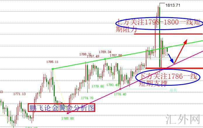 黄金星期五夜里的行情让市场为之一惊,自开盘后接连适当度的上涨,保持至美盘而且最高刷新到1813一线后,在大家以为以为这是买方的强劲击穿,但最终依旧给市场上了一课,经历迅速的回撤后面,最低又一次刷新到1784一线位置,在1813一线开始震荡无力往上击穿时候鹏飞论金也是一直强调不要过分看涨,谨防行情迈出一个“深V”反转,果不其然,在1810一线时候大家以下的多单就开始相继获利退场,又一次验证了那就话,从哪里上去就会回归那里。