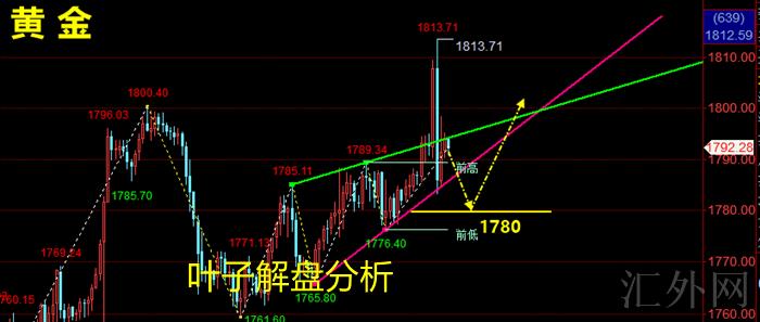 黄金星期五夜里的行情让市场为之一惊,自开盘后接连适当度的上涨,保持至美盘而且最高刷新到1813一线后,在大家以为以为这是买方的强劲击穿,但最终依旧给市场上了一课,经历迅速的回撤后面,最低又一次刷新到1784一线位置,在1813一线开始震荡无力往上击穿时候叶子也是一直强调不要过分看涨,谨防行情迈出一个“深V”反转,果不其然,在1810一线时候大家以下的多单就开始相继获利退场,又一次验证了那就话,从哪里上去就会回归那里。