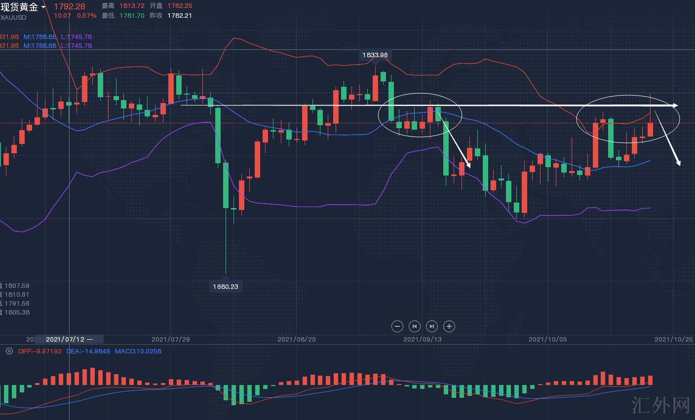 ②、现在究竟该如何选择呢?咱们从市场方面来说缩债对于黄金的抑制极大,那么若下周不能去成功立住1800高位,黄金恐怕会铸就高台显现持续下挫的模式,加上星期五冲顶后大幅回调收线,这在一定程度上加强了短时间的到顶风险,收线又遇阻于200日移动均线,故此不消除下周初先驱走跌风险。