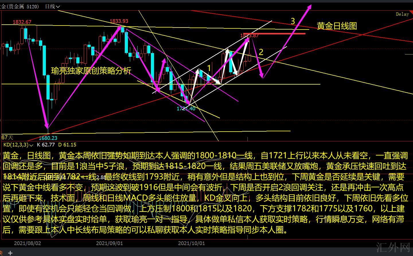 黄金,日K图,黄金这周依旧强劲按计划到达本人强调的1800-1810一线,从1721上涨以来本人从未看跌,一直强调回踩依旧多,当前是1浪当中5子浪,预计到达1815-1820一线,结果星期五美联储又放嘴炮,黄金遇阻迅速吐回到达1814左右后回归1782一线,最终收线到1793左右,略有无意中但是结构上也到位,下周黄金能否保持是核心,需求说下黄金中线看涨不变,预计这段到破1916但是中间会有波折,下周能否开放2浪回踩关注,依旧再打击一次高位后再砸下来,技术分析,周线和日K线MACD买方能住放量,KD金叉往上,买方结构当前依旧不错,下周依旧先看涨位置,即便有空机会只能轻仓当回踩做,上方抑制1800和1815以及1820,以下支撑1782和1775以及1760,以上推荐仅供参考具体实盘实时给单,获取瑜亮一对一指导,具体做单私信本人获取实时策略,行情瞬息万变,网络有落后,需求跟上本人中长线布局策略的可以私聊获取本人实时策略指导同步本人圈。