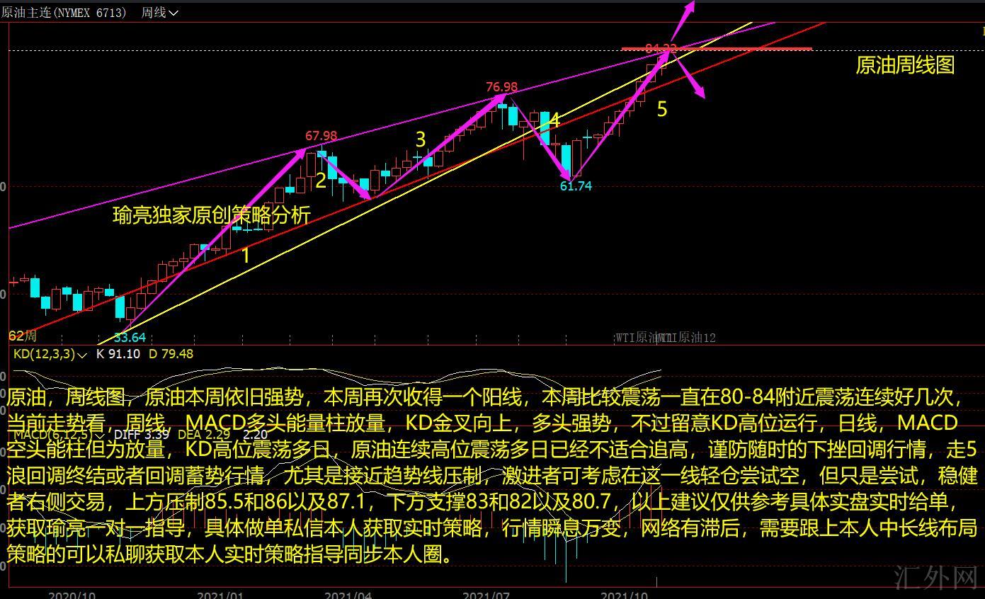 原油,周线图,原油这周依旧强劲,这周又一次收得一个阳线,这周比较震荡一直在80-84左右震荡接连好几次,目前行情看,周线,MACD买方能量柱放量,KD金叉往上,买方强劲,然而留心KD高点运行,日K线,MACD卖方能柱但为放量,KD高点震荡多日,原油接连高点震荡多日已经不适合追涨,谨防随时的下跌至踩行情,走5浪回踩结束或者回踩蓄势行情,特别是靠近趋势线抑制,激进派可斟酌在这一线轻仓试图空,但导致试图,稳健者右侧交易,上方抑制85.5和86以及87.1,以下支撑83和82以及80.7,以上推荐仅供参考具体实盘实时给单,获取瑜亮一对一指导,具体做单私信本人获取实时策略,行情瞬息万变,网络有落后,需求跟上本人中长线布局策略的可以私聊获取本人实时策略指导同步本人圈。