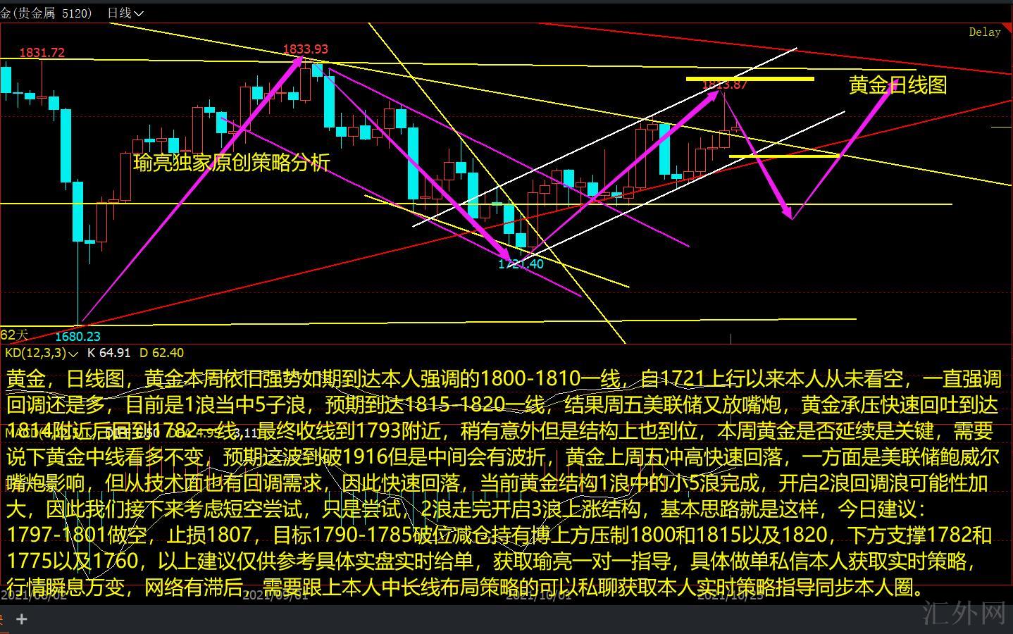 黄金,日K图,黄金这周依旧强劲按计划到达本人强调的1800-1810一线,从1721上涨以来本人从未看跌,一直强调回踩依旧多,当前是1浪当中5子浪,预计到达1815-1820一线,结果星期五美联储又放嘴炮,黄金遇阻迅速吐回到达1814左右后回归1782一线,最终收线到1793左右,略有无意中但是结构上也到位,这周黄金能否保持是核心,需求说下黄金中线看涨不变,预计这段到破1916但是中间会有波折,黄金上星期五冲顶迅速回调,一面是美联储鲍威尔嘴炮影响,但从技术分析也有回踩需求,所以迅速回调,目前黄金结构1浪中的小5浪完成,开放2浪回踩浪机会加大,所以我们接下去斟酌短空试图,导致试图,2浪走完开放3浪上升结构,差不多思路就是如此,今日推荐:1797-1801买跌,止损1807,计划1790-1785突破减仓持有博上方抑制1800和1815以及1820,以下支撑1782和1775以及1760,以上推荐仅供参考具体实盘实时给单,获取瑜亮一对一指导,具体做单私信本人获取实时策略,行情瞬息万变,网络有落后,需求跟上本人中长线布局策略的可以私聊获取本人实时策略指导同步本人圈。